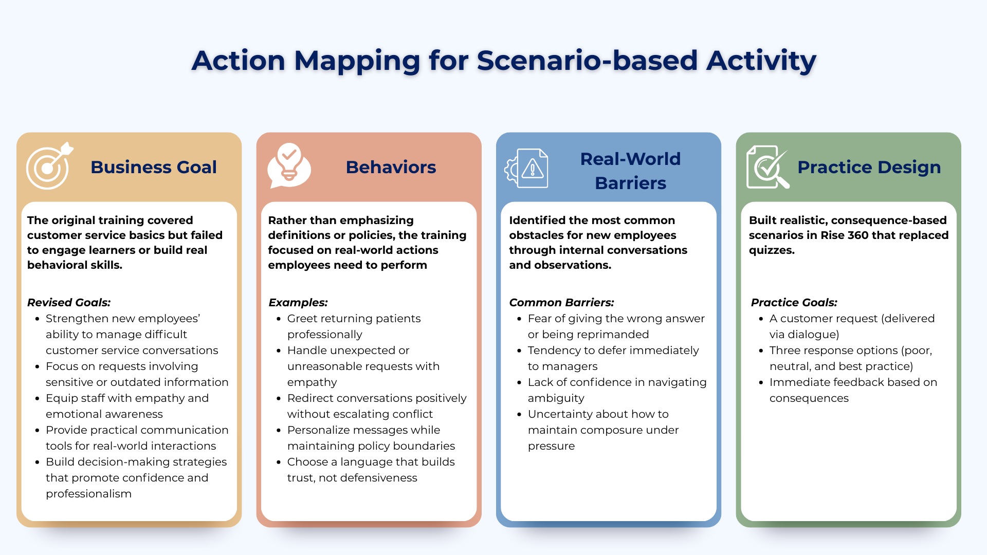 What I Did The original training was a plain-content module that introduced customer service expectations and ended with a short quiz. However, it lacked behavioral depth or emotional engagement. Using Cathy Moore’s Action Mapping model, I built the learning experience from the ground up based on an authentic instructional problem when I revised the training in 2023. Through conversation and feedback from new employees and current staff members, I identified the key behaviors new employees needed to adopt, uncovered the emotional and systemic barriers holding them back, and designed practice activities that allowed for realistic, consequence-based decision making.
