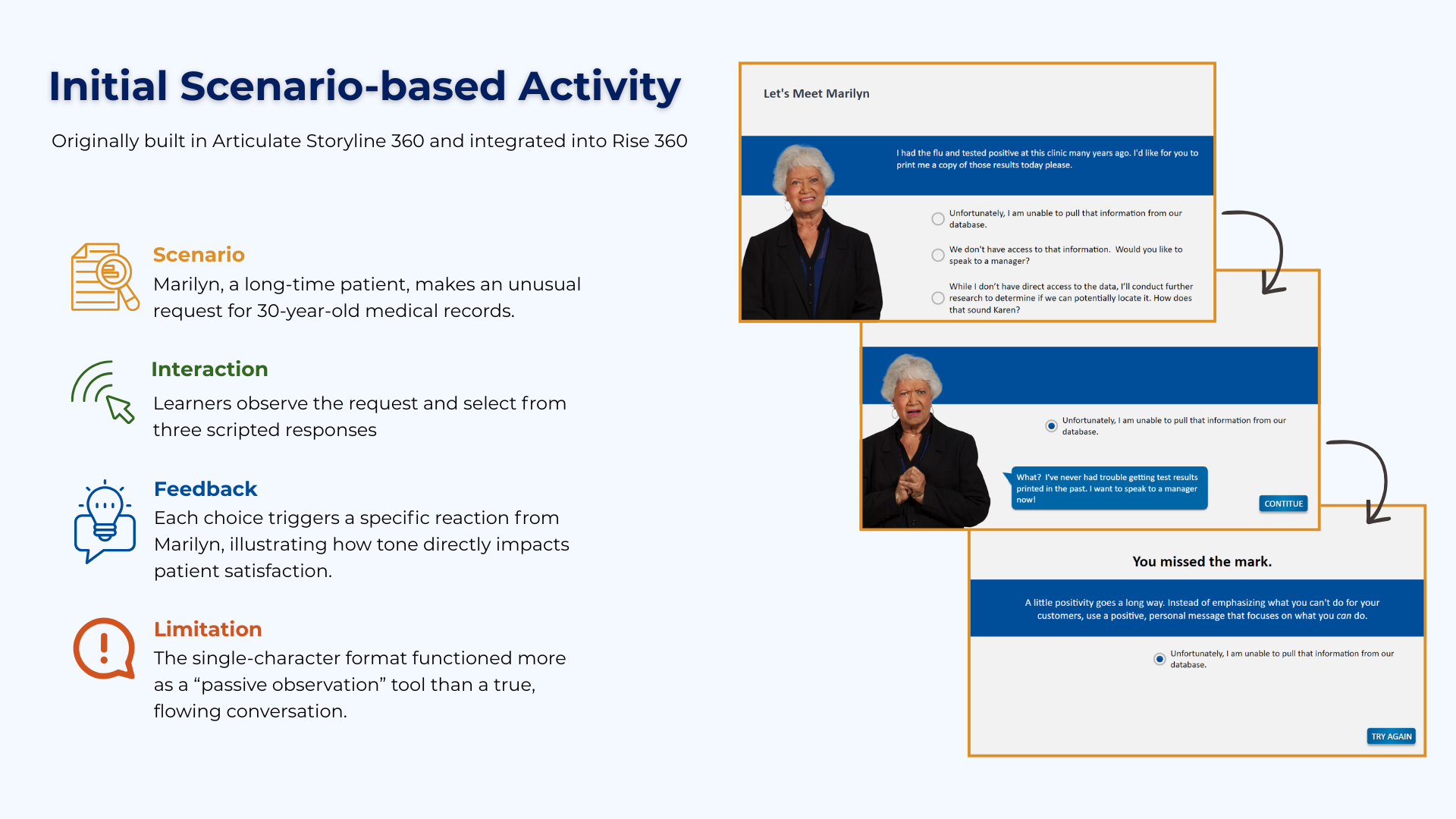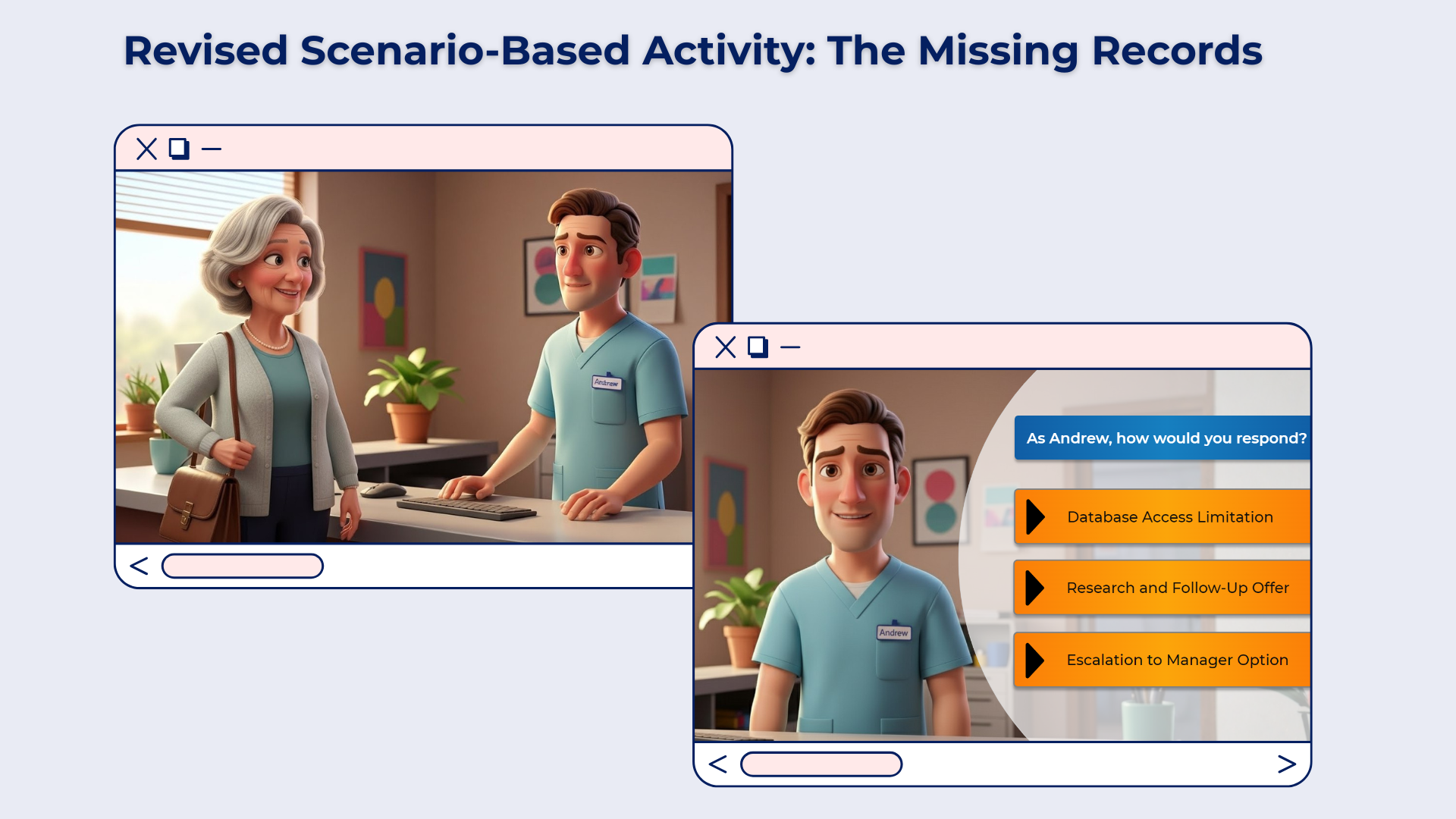 By allowing the learner to step into Andrew’role and navigate multiple outcomes, the scenario moved from passive review to active skill rehearsal.